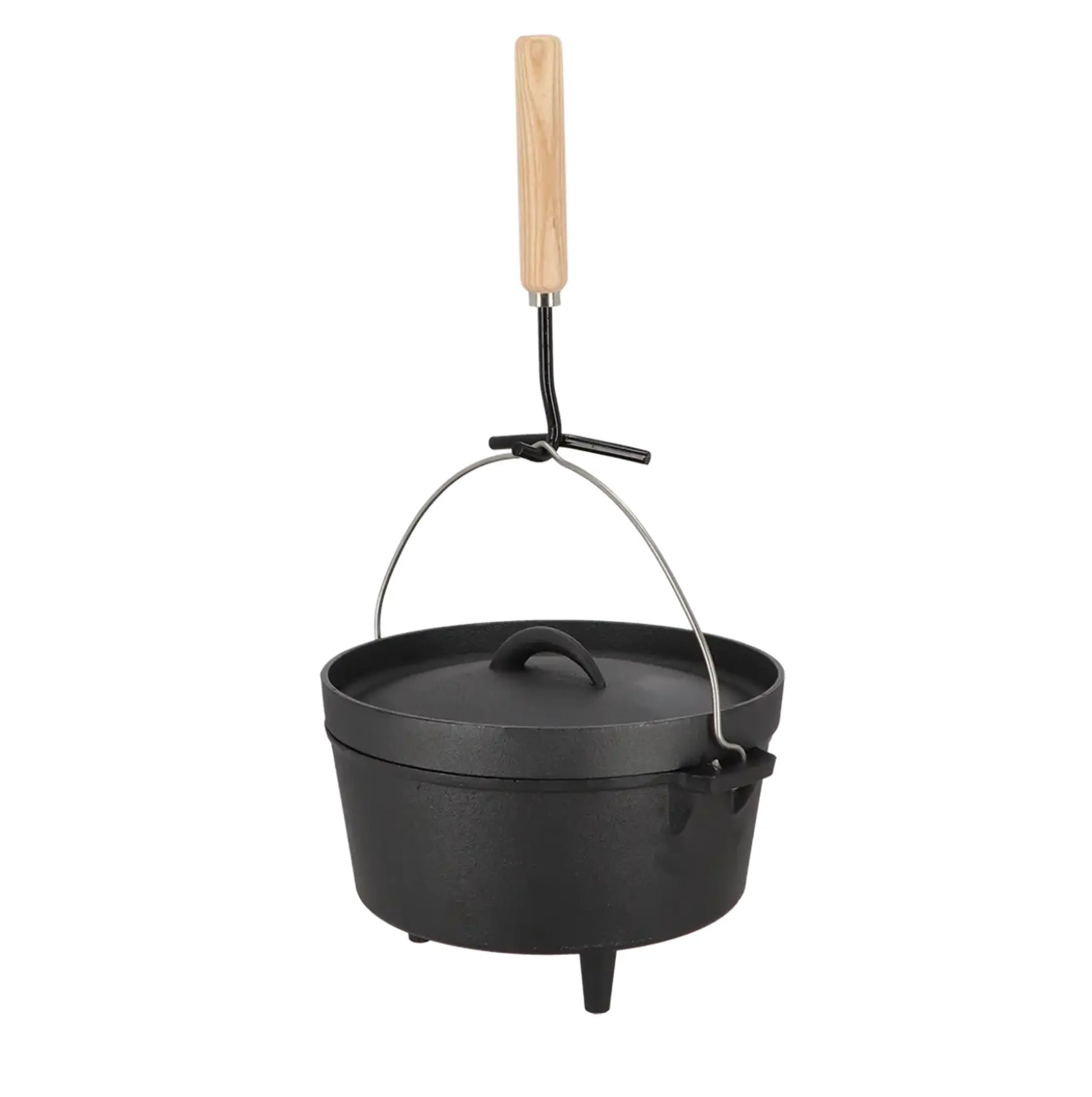 Stabiler Stand, flexibler Einsatz: Die drei integrierten Füße sorgen für sicheren Halt direkt in der Glut. Alternativ hängst du den Topf einfach an den Henkel über deine Feuerstelle. Der mitgelieferte Deckelheber schützt dabei zuverlässig vor Verbrennungen.